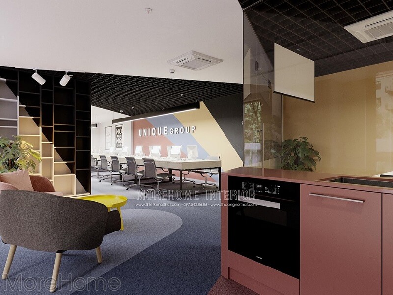 Thiết kế văn phòng công ty UNIQUE GRORP với không gian mở gồm quầy lễ tân phòng làm việc nhân viên, phòng họp, phòng giám đốc..