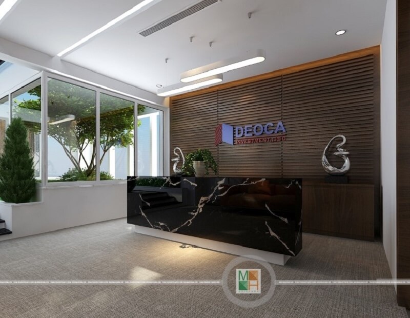 Trang trí quầy lễ tân văn phòng Đẻo Cả đẹp sử dụng đá nhân tạo ốp bàn làm việc với những đường vân độc đáo kết hợp gỗ ốp tường phía sau mang đến vẻ đẹp hiện đại, sang trọng