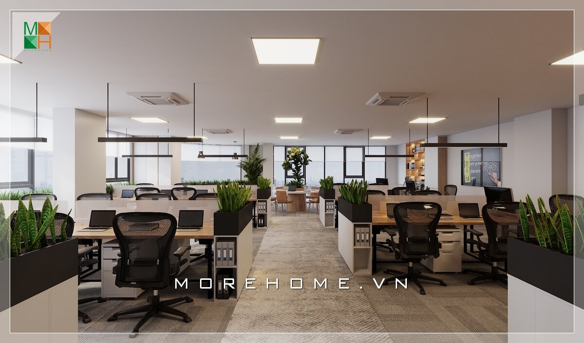 Bố trí nội thất phòng làm việc hiện đại, khoa học, vừa đảm bảo công năng trong quá trình sử dụng, đồng thời vẫn đảm bảo tính riêng tư của mỗi nhân viên